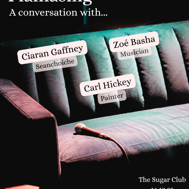 Plámásing is a talk show–style live event featuring on stage interviews with a diverse panel of guests, including Ciaran Gaffney (storyteller), Carl Hickey (artist/painter), and Zoé Basha (musician) who will also be performing from her gorgeous debut album: Gamble.