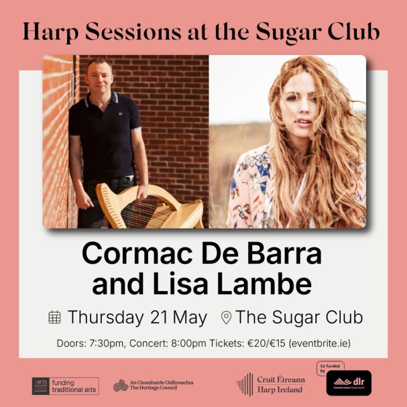 Two leading voices in Irish music, harper Cormac De Barra and singer Lisa Lambe present a night of harp and voice in the iconic Sugar Club. Two leading voices in Irish music, harper Cormac De Barra and singer Lisa Lambe, perform at Harp Sessions at The Sugar Club, the second in our 2026 series. Cruit Éireann is proud to premiere their collaborative work, Macalla na Mara | Sea Echoes; a new composition for harp and voice, inspired by our deep connection to the sea and a response to climate change and rising sea levels. Commissioned by Cruit Éireann, with support from dlr County Council, Macalla na Mara is a new work by two renowned artists and an artistic response to current challenges to the environment. Set in the intimate and iconic surroundings of The Sugar Club in the heart of the city, this concert also features music that reflects the rich harping tradition and explores contemporary Irish song and harp from two consummate performers.